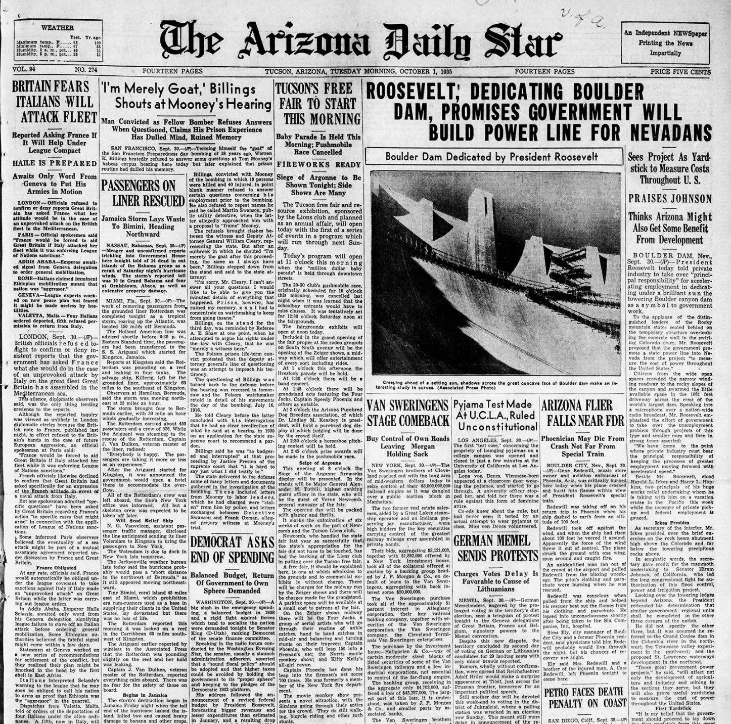 Oct.1 Arizona Daily Star front pages: Boulder Dam dedicated