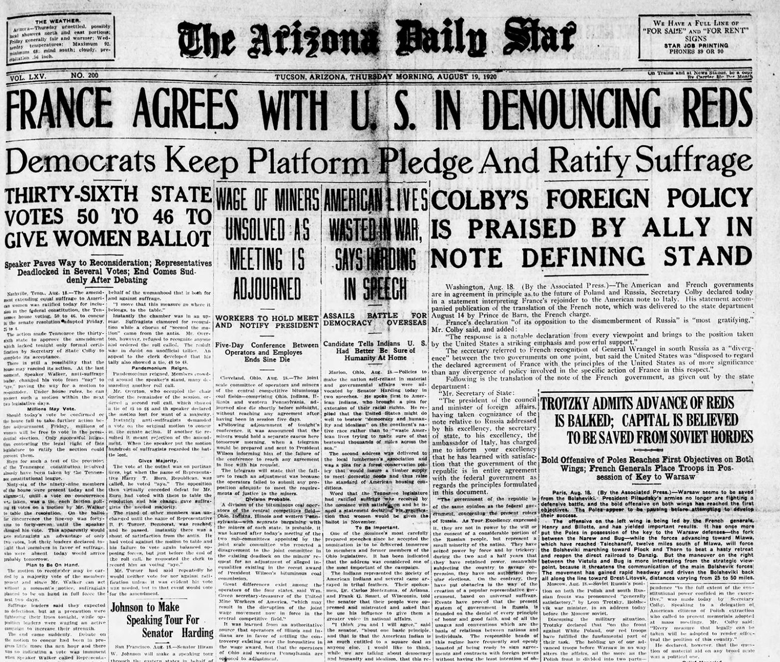 Aug. 19 Arizona Daily Star front pages: Women win right to vote
