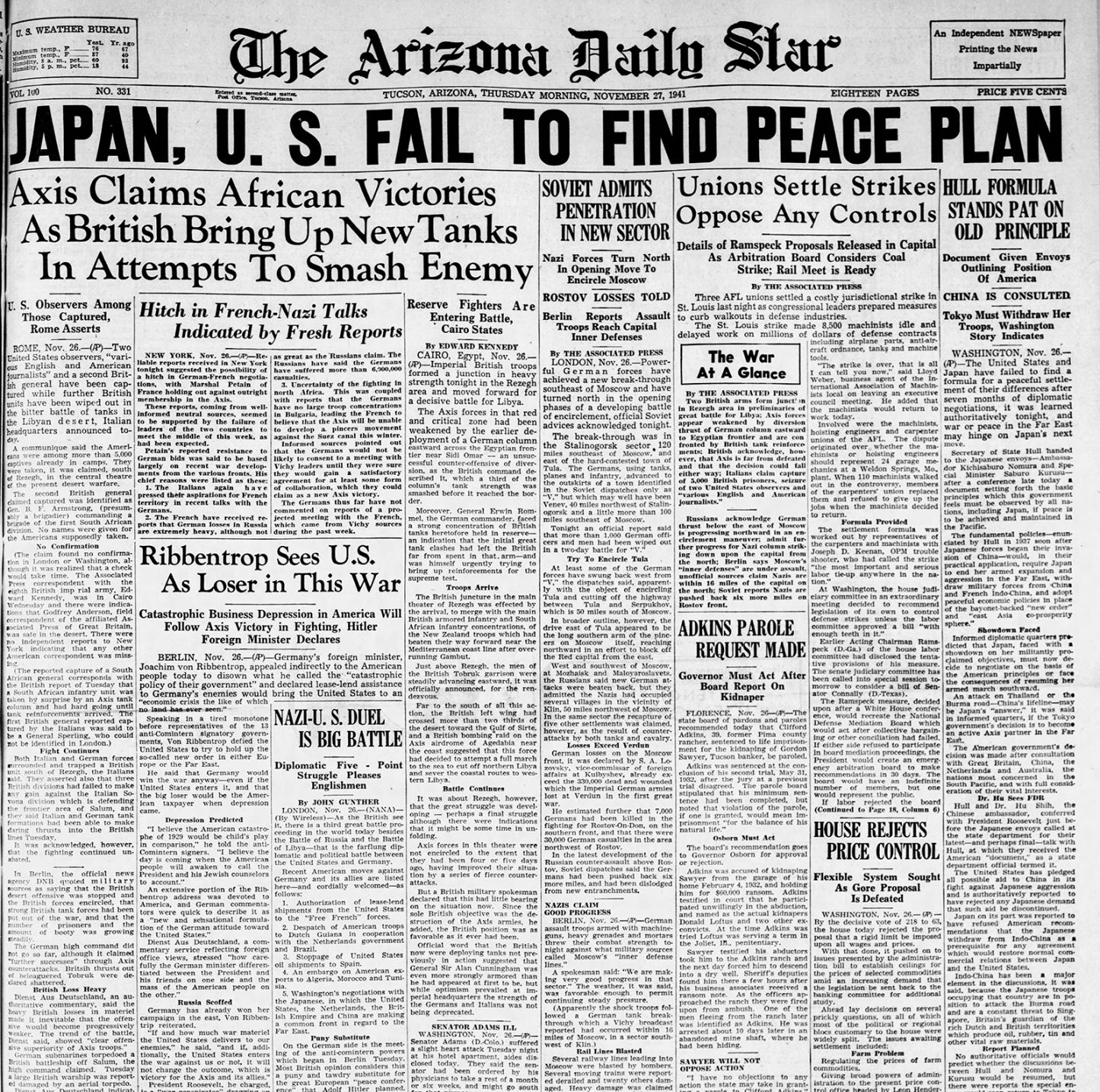 Nov. 27 Arizona Daily Star front pages: No peace with Japan