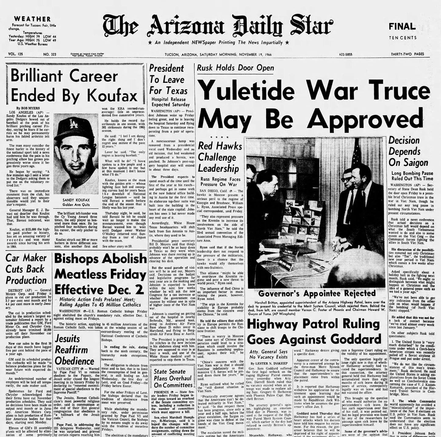 Nov. 19 Arizona Daily Star front pages: Sandy Koufax retires