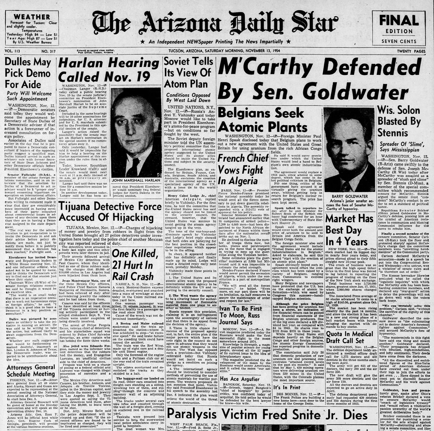 We've collected a few front pages from newspapers.com to give you a look at some Nov. 13 papers in history. With a subscription to newspapers.com you can search the Arizona Daily Star and many other newspapers using keywords or dates, and download articles or pages.