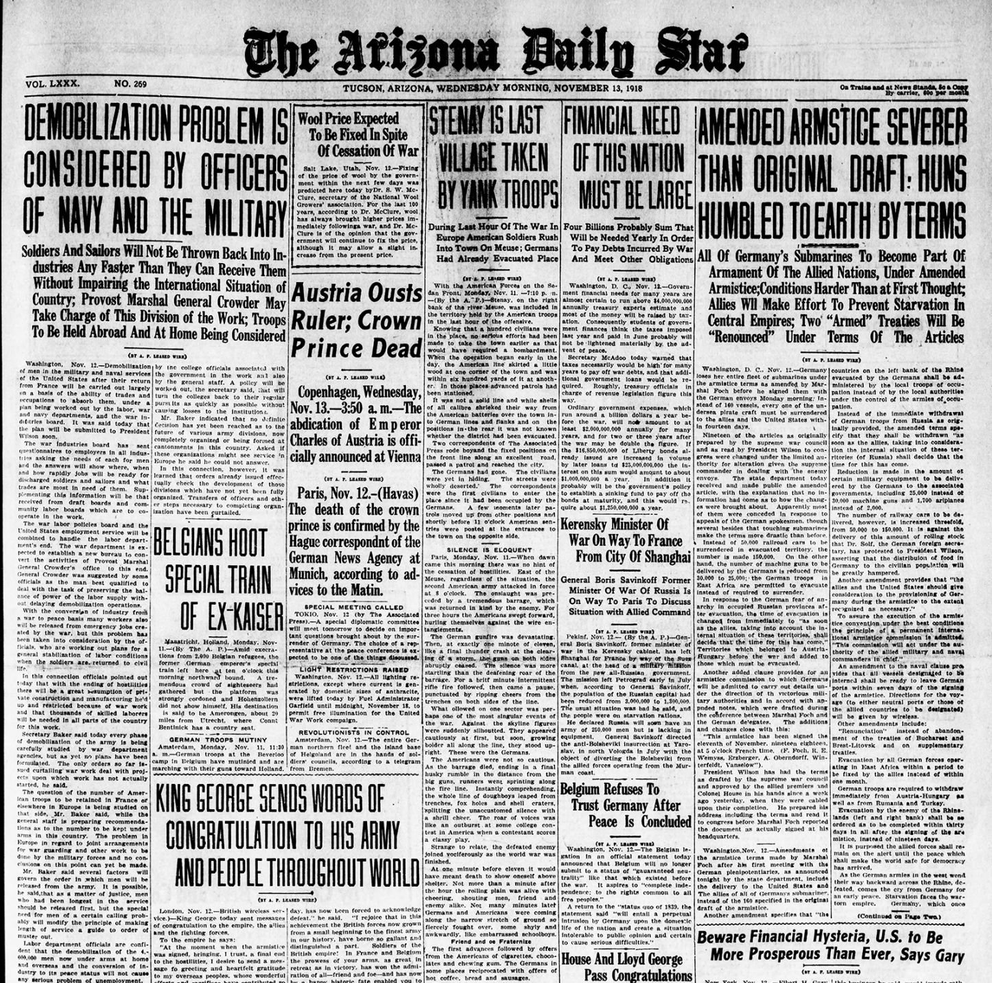 Nov. 13 Arizona Daily Star front pages: Armistice details
