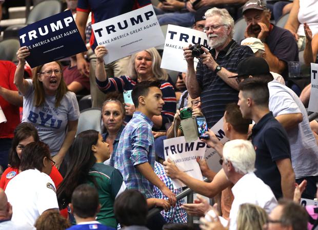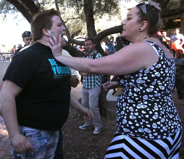 Mamta Popat / Arizona Daily Star: A Donald Trump supporter and protester exchange words as attendees file into the Tucson Convention Center to hear the presidential candidate speak on Saturday March 19, 2016. |