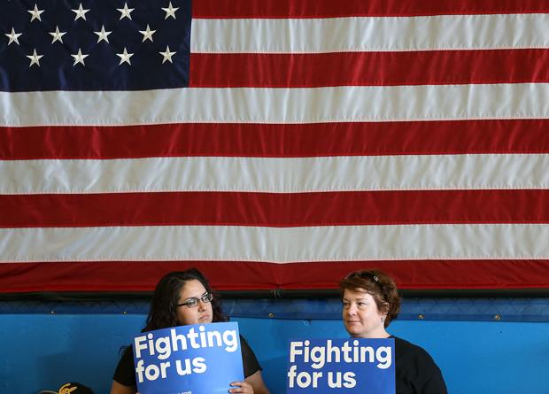 Mamta Popat / Arizona Daily Star: A couple of Hillary Clinton supporters wait for the start of a rally where former president Bill Clinton will stump for his wife Hillary at Sunnyside High School on Sunday March 20, 2016 in Tucson. |