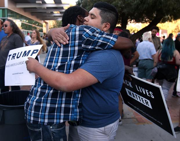 Mike Christy / Arizona Daily Star: Jesus Sanchez, right, a Donald Trump supporter, hugs Leon Powell, a Trump protester after the Republican presidential candidate's rally at the TCC. |