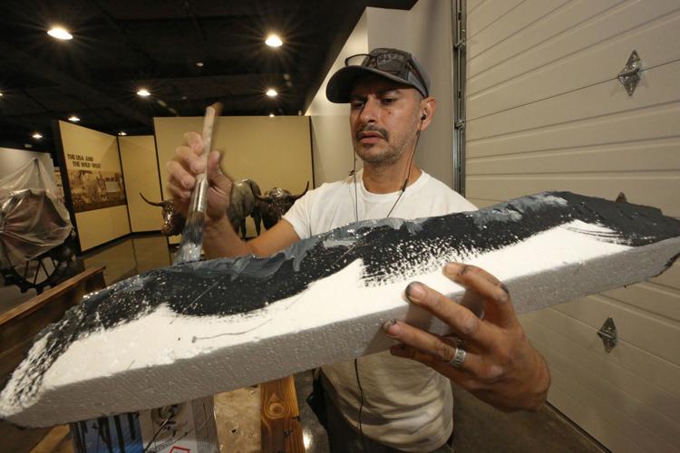 Myles K. Erwin, a general manager with Bowlin Travel Centers, Inc., spreads out a wall display in the new entryway as renovations and revelations that are out of this world are taking place at The Thing in Dragoon, Ariz., on Aug. 21, 2018. Bowlin, which operates the combination roadside attraction, Dairy Queen and gift shop an hour east of Tucson along Interstate 10, is making substantial changes to their display. Known for its billboard ads that line I-10 for miles around, The Thing is rewriting human history with the help of aliens and dinosaurs.