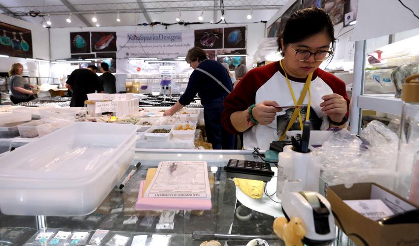 Sergio Ruiz bends to get a closer look at the various gemstones for sale at the Village Silverspoon booth inside of the 22nd Street Gem Show on Jan. 30, 2024.