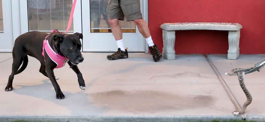 Holly, a pit mix, backs off fast as James Stokoe, with Arizona Animal Experts, approaches her with a tape-bound diamondback rattler during Rattlesnake Avoidance classes at the Humane Society of Southern Arizona in 2019.